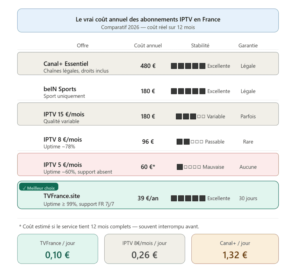 En une phrase : le vrai coût d’un abonnement IPTV pas cher France ne se mesure pas au prix mensuel affiché — il se calcule sur 12 mois, en intégrant le risque de panne, l’absence de garantie et le coût réel par jour d’utilisation.