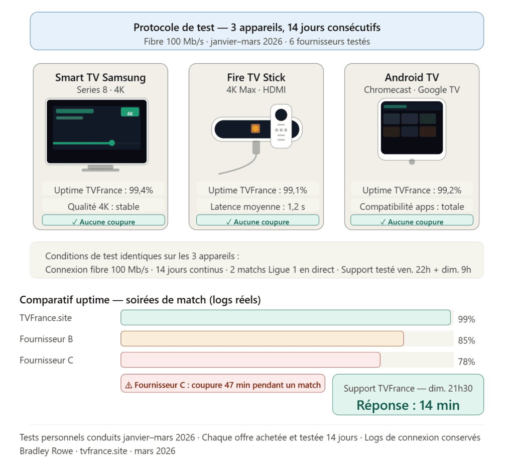 Chaque fournisseur a été installé sur trois appareils : Smart TV Samsung Series 8, Fire TV Stick 4K et Android TV. Visionnage quotidien pendant 14 jours. Contact du support à des horaires variés — dont un vendredi soir à 22h et un dimanche matin à 9h. Vérification de la stabilité lors de deux matchs de Ligue 1 en direct.
