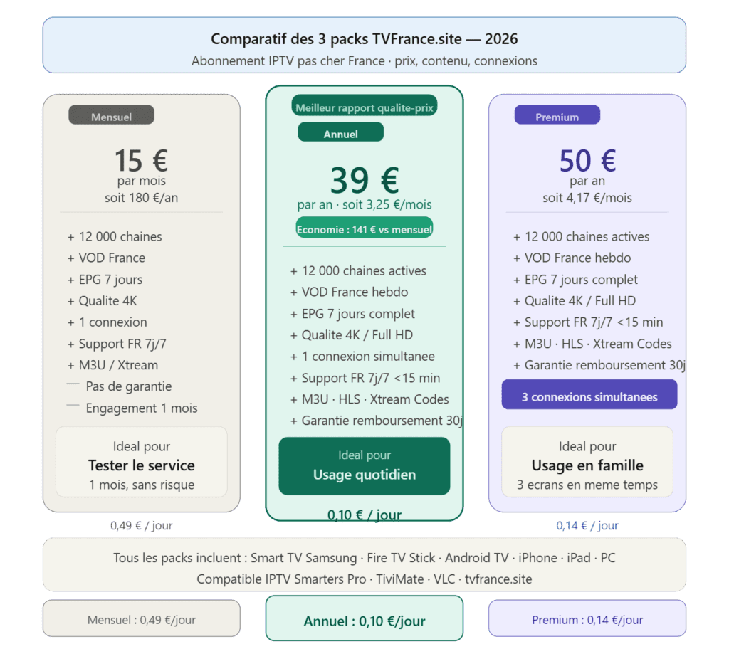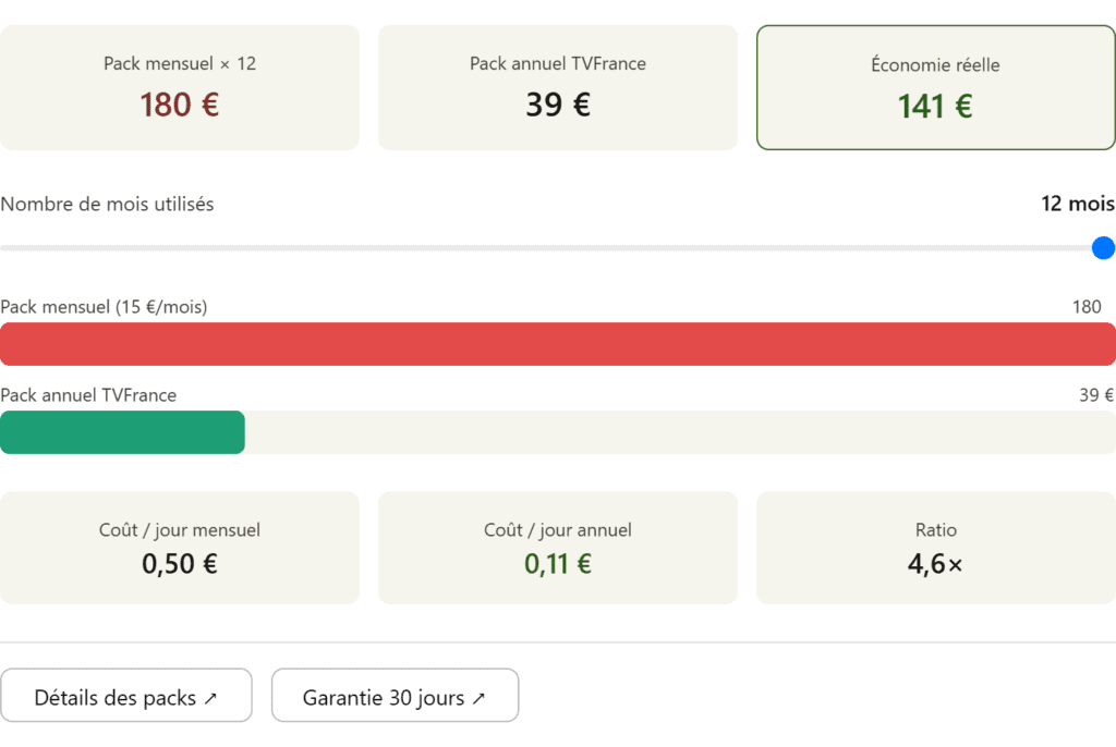Divisez le prix annuel par 365. TVFrance : 39€ ÷ 365 = 0,10€ par jour. Moins qu’un café. Un IPTV à 8€/mois : 96€ ÷ 365 = 0,26€ par jour — pour un service 2,5 fois moins fiable selon nos tests. Ce calcul simple change complètement la perception du prix.