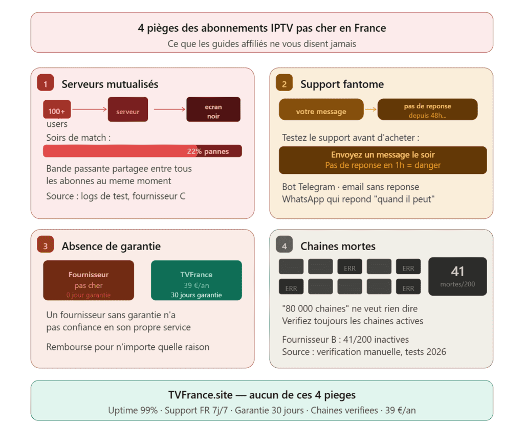 En une phrase : un abonnement IPTV pas cher France peut cacher 4 pièges majeurs — serveurs mutualisés, support fantôme, absence de garantie et chaînes mortes — que les guides affiliés ont intérêt à ne pas vous révéler.