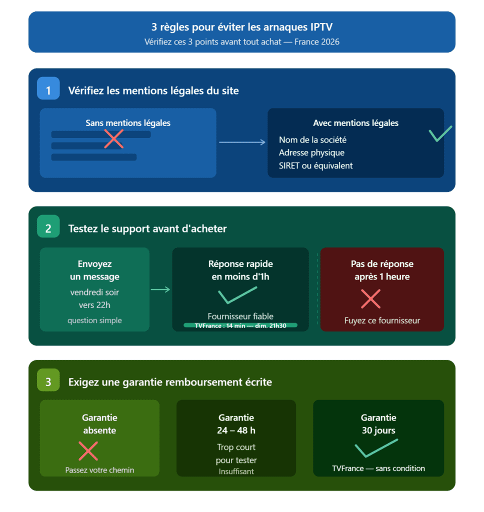 Trois règles simples : vérifiez que le site affiche des mentions légales complètes, testez le support avant d’acheter votre abonnement IPTV, et exigez une garantie remboursement écrite. Si l’un de ces trois éléments est absent, passez votre chemin.