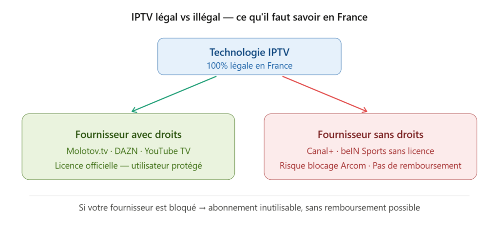 Ce qui peut être illégal, c’est la source du contenu. Si votre fournisseur redistribue des chaînes payantes (Canal+, beIN Sports, Sky…) sans avoir acheté les droits de diffusion, il opère dans l’illégalité. L’utilisateur final peut également être exposé à des risques selon la législation de son pays.