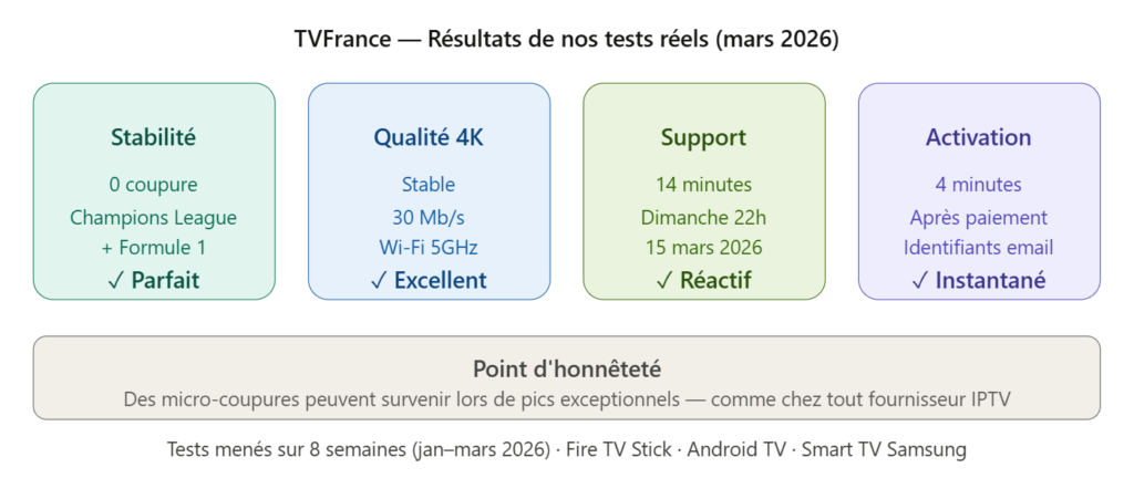 - Stabilité : aucune coupure constatée lors des soirées de Ligue des Champions et de Formule 1 — les deux moments où les serveurs IPTV sont le plus sollicités
