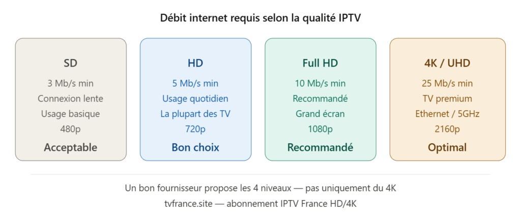 La qualité ne dépend pas que du fournisseur — votre connexion internet joue aussi un rôle. Mais un bon fournisseur d’abonnement IPTV France propose plusieurs niveaux de qualité pour s’adapter à votre débit :