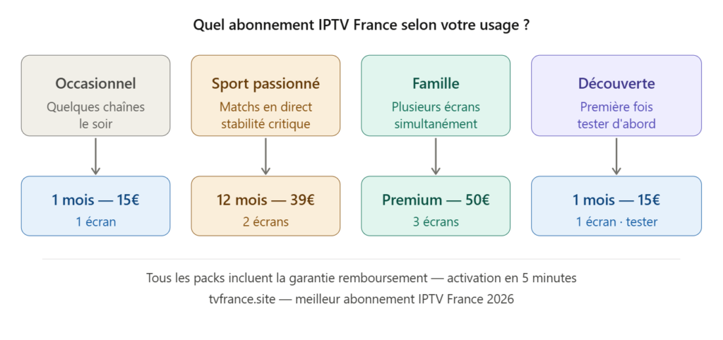 Il n’y a pas un meilleur abonnement IPTV France universel — il y a le meilleur abonnement pour vous. Voici comment choisir selon votre situation :